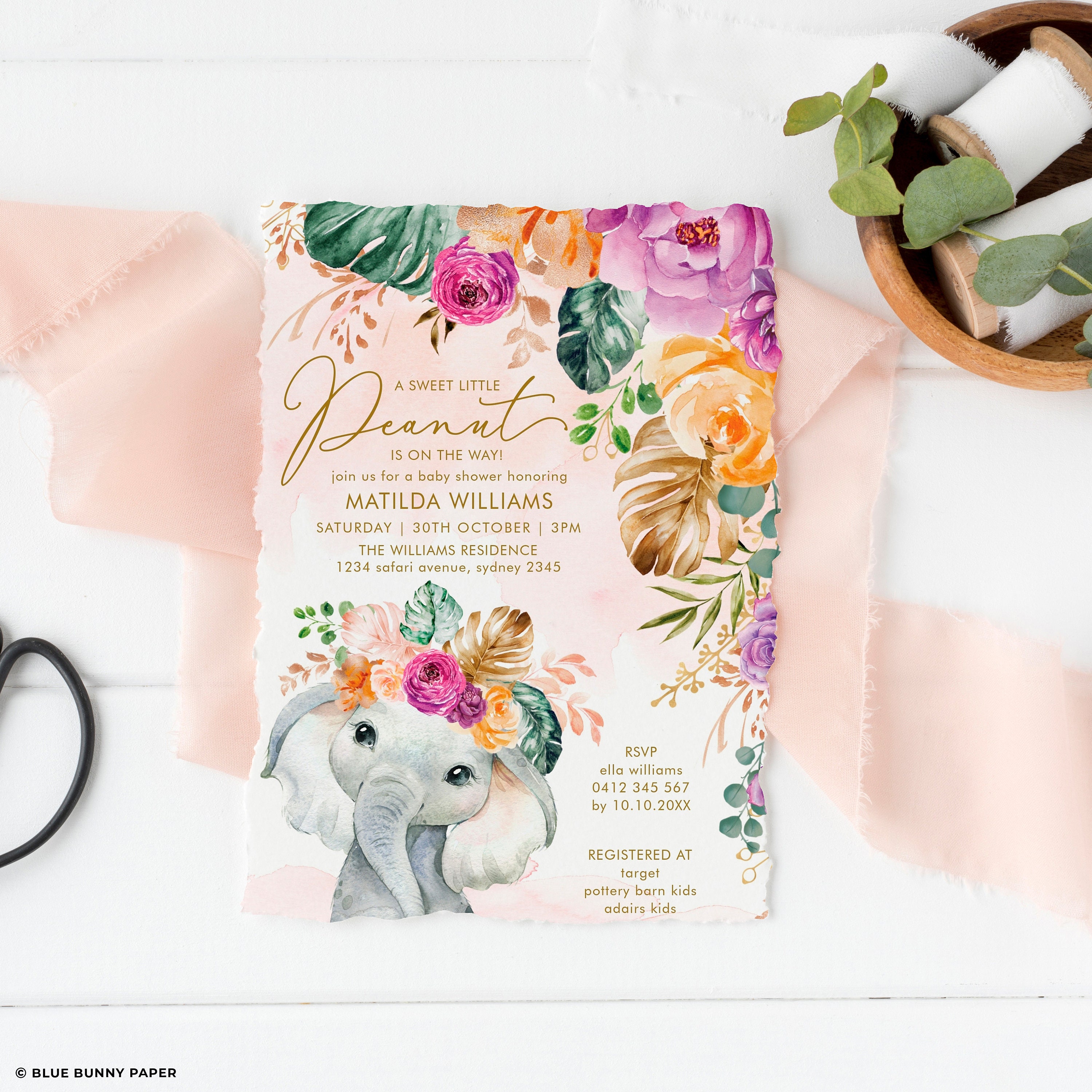 Boho Tropical Elephant Baby Shower Invitation Orange Purple Etsy